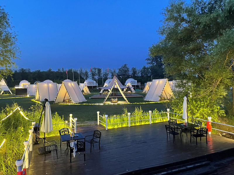 此區(qū)塊位于規(guī)劃地塊的東北角濱水區(qū)塊,該區(qū)塊項(xiàng)目設(shè)計(jì)意在配合度假酒店,加載精品化的休閑度假項(xiàng)目,打造精品度假體驗(yàn)。其主要內(nèi)設(shè)項(xiàng)目包括垂釣俱樂部、房車營地、篝火廣場、精品帳篷酒店、帳篷餐廳和露天燒烤園等等